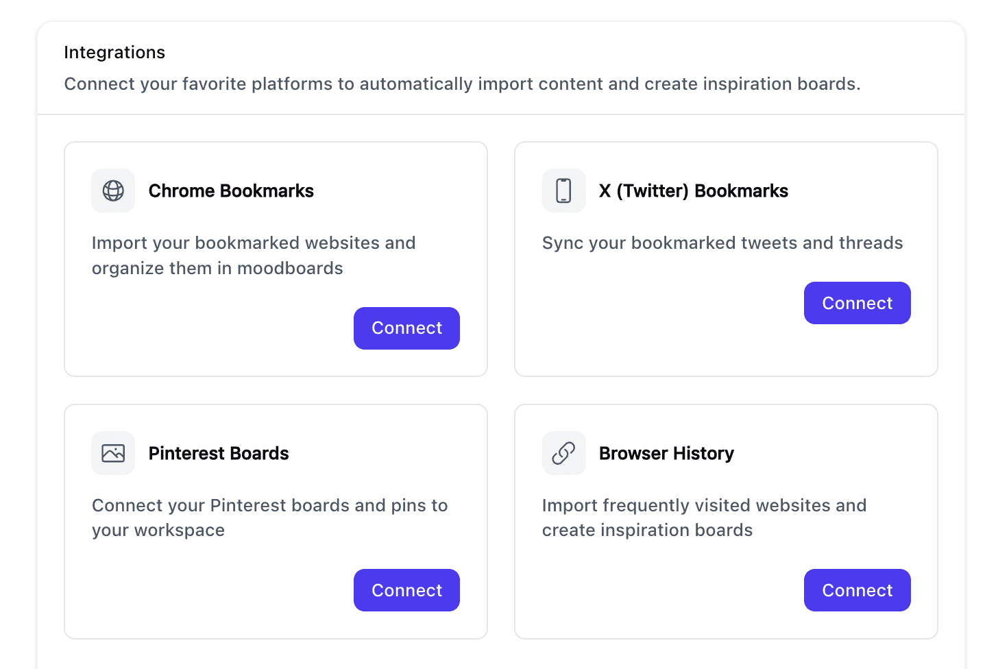 Bookmark anything using this pop-up button on any site you use for inspiration. Pinterest, X, Instagram, Behance, you name it.